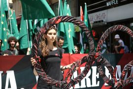 May 21 Platformu üyeleri, Çerkes soykırımın 149’uncu yıl dönümünde 2014 Kış Olimpiyatlarının Sochi’de yapılacak olmasından dolayı Rusya Federasyonu Başkonsolosluğu önüne olimpiyat halkası bıraktı.![]() May 21 Platformu üyesi yaklaşık 250 kişilik grup, Çerkes soykırımının 149’uncu yıldönümü nedeniyle Rusya Federasyonu önünde bir araya geldi. Burada “Katil Rusya” şeklinde sloganlar atan grup İngilizce “Rusya biz geri geldik” şeklinde pankart açtı. Daha sonra grup adına açıklama yapan Fehmi Erdem Aybulut, “Bu yıl öncekilere göre sesimiz daha gür. Çünkü ulusların yükseldiği bir çağda yok olmayan mahkum edilen Çerkes ya da soykırımın en kanlı sahnelerinin yaşandığı Kbaada Vadisinde önümüzdeki yıl yani soykırımını 150’inci yılında ulusları buluşturarak Sochi kış olimpiyat oyunları gerçekleştirilecek. Sochi olimpiyatlara aday olduğu gün başlattığımız kampanyayla bu olimpiyatların tarihsel bir suçu örtbas etmeye ve yenilerine kapı açmaya hizmet edeceğini anlatmaya rağmen itirazlarımızdan bir sonuç alamadık. Böylece olimpiyat komitesi, korumakla sorumlu olduğu olimpiyat değerlerini bir kez daha ayaklar altına alacak bir süreci başlatmış oldu” dedi. Açıklamanın ardından grup, yanlarında getirdikleri olimpiyat halkalarını Rusya Federasyon binasının duvarına bıraktı. Daha sonra grup sloganlar eşliğinde olaysız bir şekilde dağıldı. |
